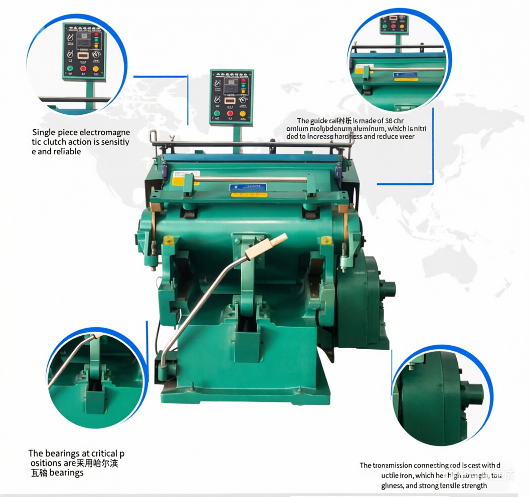 The machine is composed of machine base, moving platen, electromagnetic clutch, electrical equipment control component, automatic recorder and time delay device etc.The motor of the machine drives the flywheel, after electromagnetic effect of the electromagnetic clutch, then through speed variation of three grade gears drive the link to make the moving platen swing back and forth to finish the work cycle of feeding, creasing and cutting, and caking out finished product.Machine Base Bull wheels with eccentric shaft are fixed into two ends of the grade shaft of machine base and it drives the link to make the moving platen swing back and forth to finish the creasing and cutting of card boards.